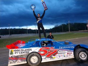 One more caution for another Goudie spin with three laps to go would be all that would slow Sandercock from his third career Sweeney Tour win in the Paul Crouter-owned, Bellevue Fabricating/Deerhaven Farming & Garden/1000 Island RV-sponsored #57 as he took the checkered flag first by 2.054 seconds. Sandercock also received another Sunoco 5-Gallon Race Jug.