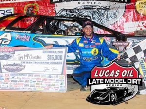 (BROWNSTOWN, IN - September 26, 2020) - Tim McCreadie went to victory lane at Brownstown Speedway as he captured the 41st Annual Jackson 100 on Saturday Night. McCreadie took the lead on lap 15 and held it the rest of the way for his second win in the last three Lucas Oil Late Model Dirt Series races. The New York Native previously won the event in 2008.
